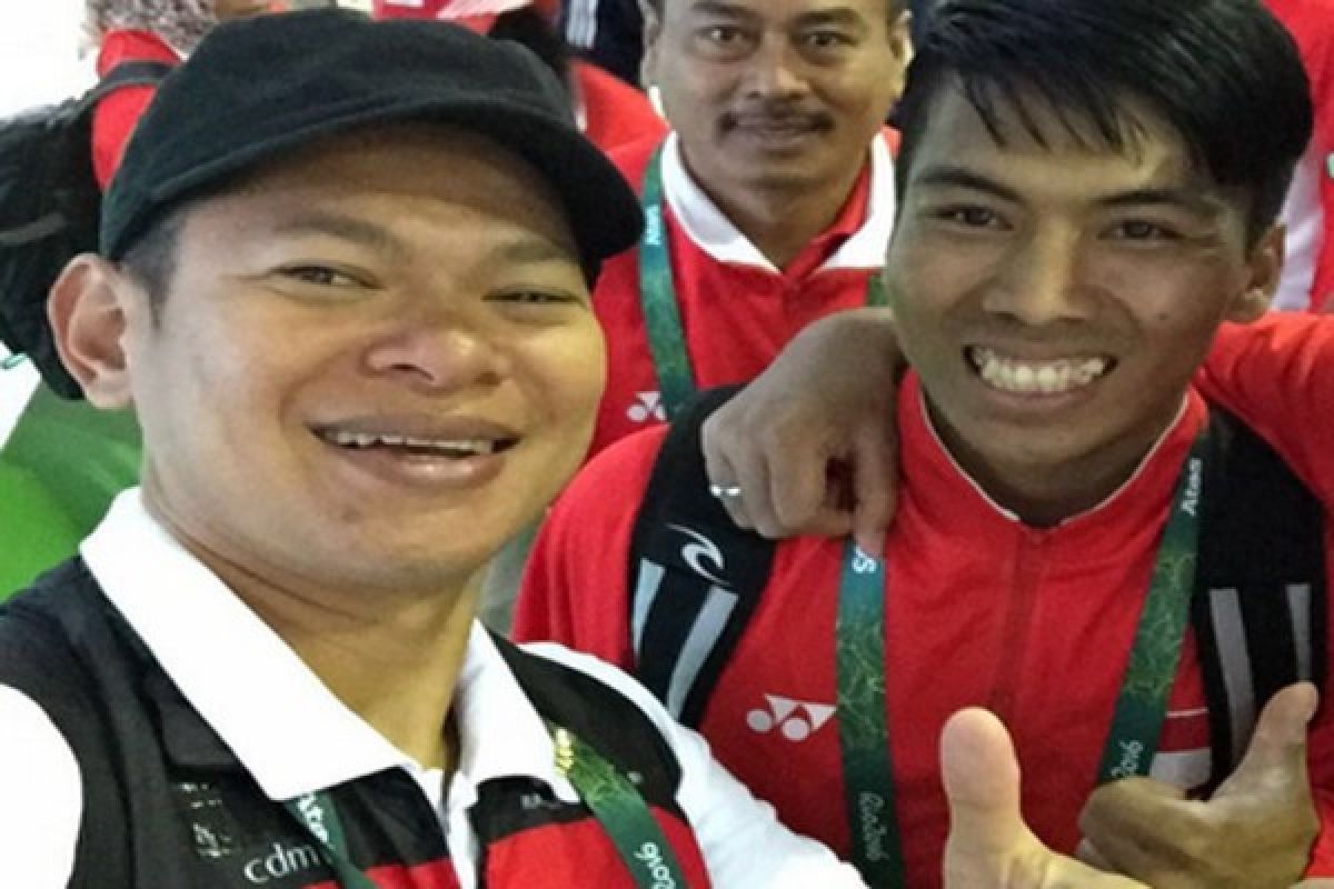 Raja Sapta Oktohari (kiri) bersama atlet angkat besi Deni dan sejumlah anggota Kontingen Indonesia di Olimpiade 2016, Rio de Janeiro, Brazil. (Twitter/@rajasaptaokto)