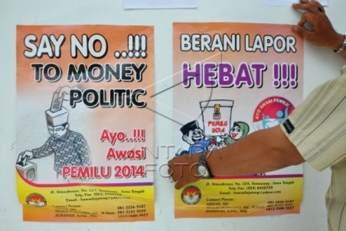 Ilustrasi - Petugas memasang poster "Berani Lapor Hebat" untuk masyarakat agar melaporkan politik uang saat Pemilu 2014. (ANTARA FOTO/Oky Lukmansyah)