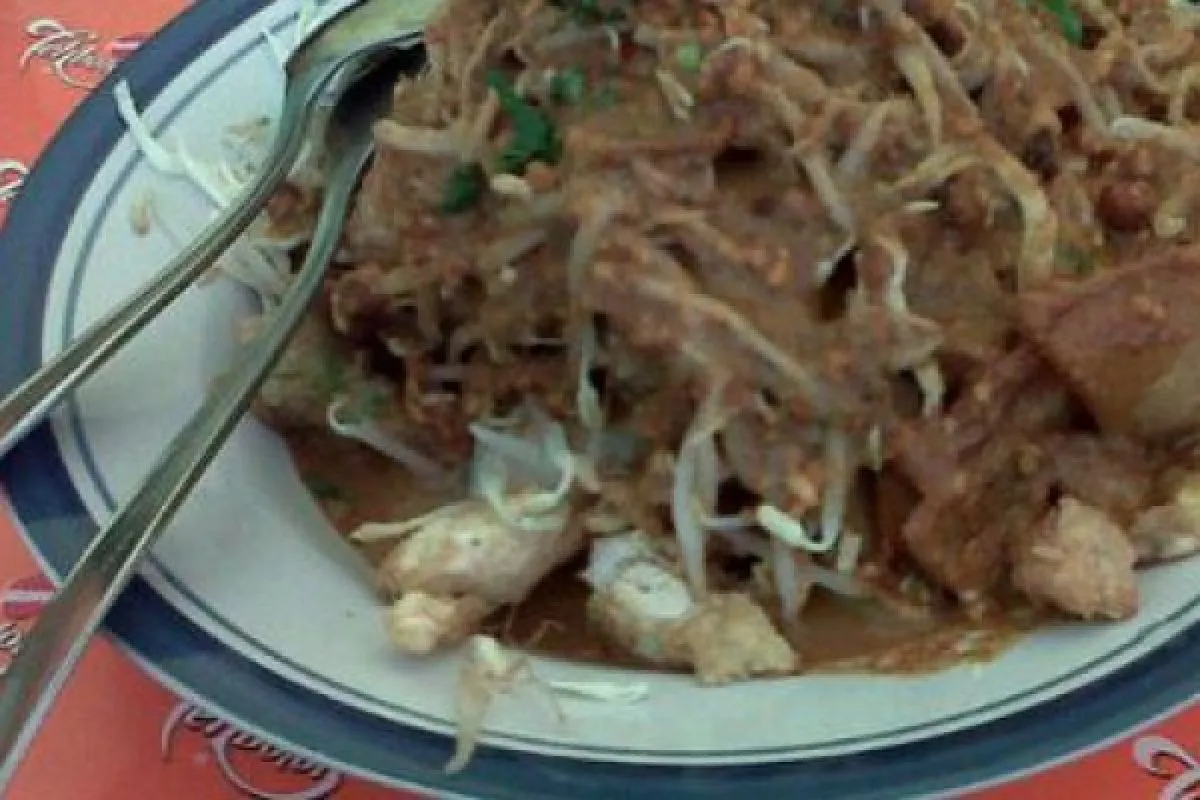 Di atas sumber karbohiodrat itu kemudian ditaburi kecambah, irisan kol, dan gimbal yang dipotong-otong. Langkah terakhir adalah menyiram bumbu kacang hingga rata.