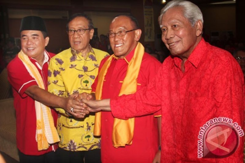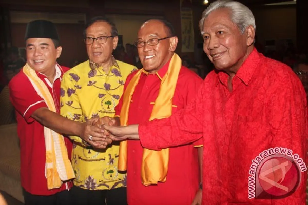 (Dari kiri ke kanan) Ketua Dewan Pimpinan Nasional SOKSI (Sentral Organisasi Karyawan Swandiri Indonesia) Ade Komarudin Penasihat Partai Golkar Akbar Tanjung, Ketua Umum DPP Partai Golkar yang juga Ketua Dewan Penasihat SOKSI Aburizal Bakri serta Pen