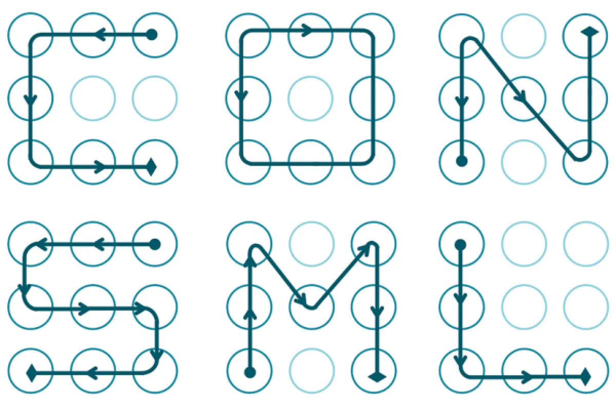 Selain jumlah simpul, pola yang lebih rumit, lebih sulit utuk dicari tahu. Seperti penelitian dalam password yang mengungkap fakta, 1234567, Password, dan Letmein merupakan password yang paling umum digunakan, 10 persen dari pola kunci yang dibuat pada penelitian ini menyerupai huruf dalam alfabet.