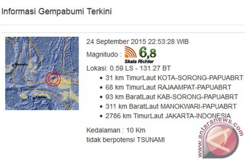 "Lokasi gempa 0.59 LS dan 131.27 BT yang berjarak 31 kilometer di timur laut Kota Sorong. Kedalaman gempa 10 km yang guncangannya terasa di beberapa kabupaten terdekat termaksud Kabupaten Manokwari," ujarnya.