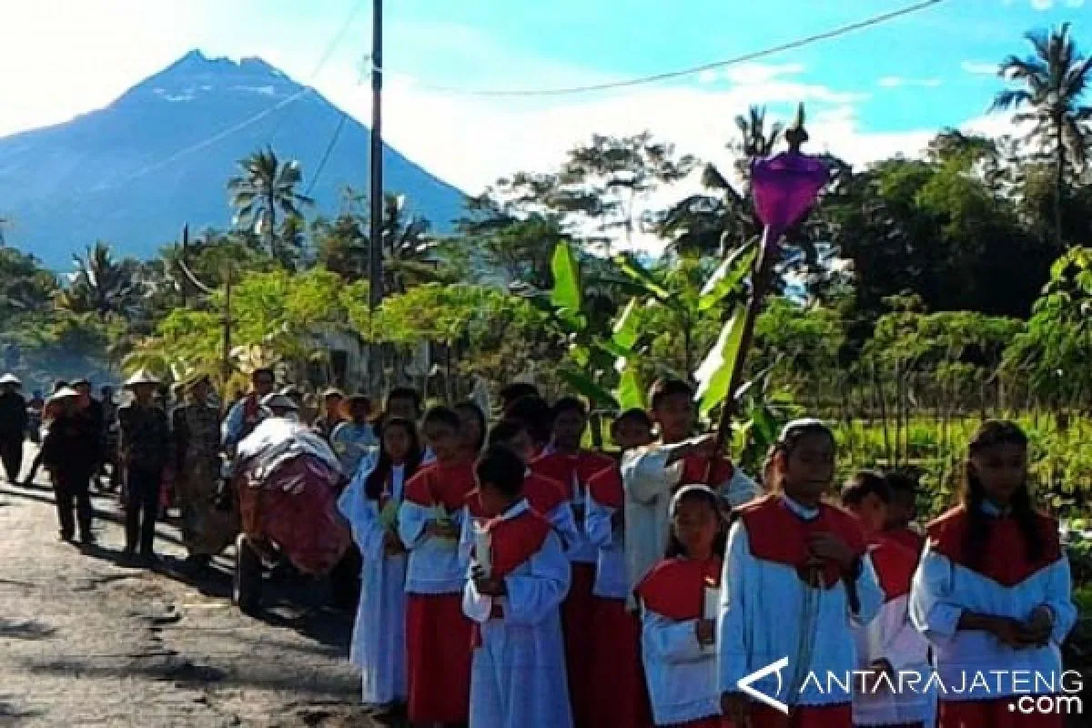 Prosesi mereka yang semarak dengan suasana cerah kawasan Merapi, Minggu itu, untuk mengenang Yesus saat disambut umat sebagai raja memasuki Kota Yerusalem dengan menunggang keledai.
