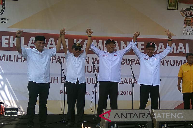 Deklarasi kampanye damai yang difasilitasi Komisi Pemilihan Umum Kabupaten Banyumas itu digelar di Taman Rekreasi Andhang Pangrenan, Purwokerto, Banyumas, Sabtu siang.