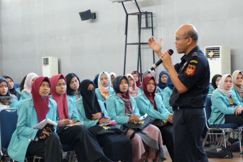 Kepala Tim Penyuluhan dan Layanan Informasi Heru Purwedi Sembiring dan Kepala Subseksi Penyuluhan Bea Cukai Tanjung Emas Yendra Robi menjelaskan tentang tugas fungsi Bea Cukai serta prosedur ekspor dan impor.