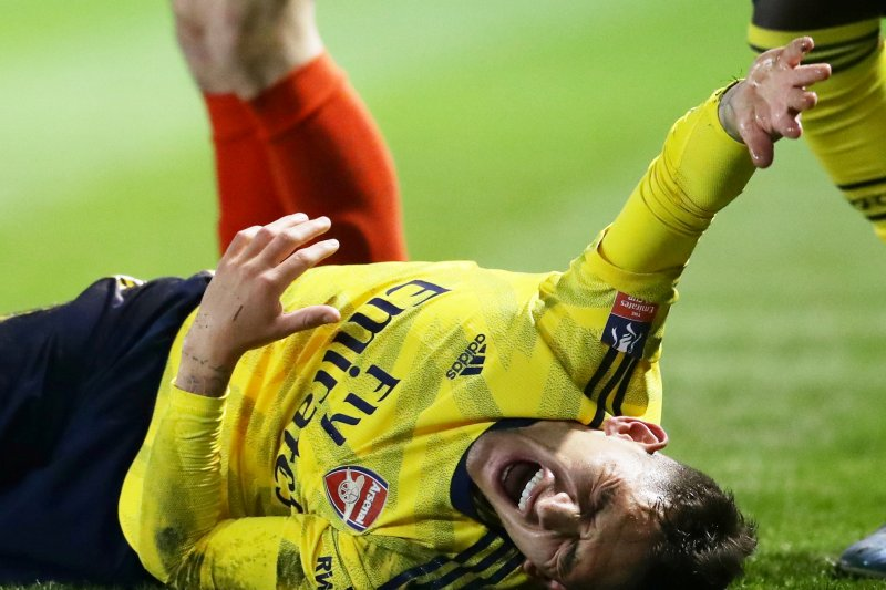Gelandang Arsenal Lucas Torreira bereaksi karena mengalami cedera saat bertanding melawan Portsmouth pada 2 Maret 2020. (REUTERS/David Klein)