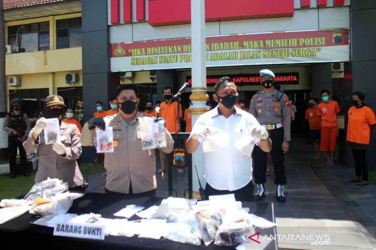 Solo (ANTARA) - Satuan Reserse Narkoba Polres Kota Surakarta berhasil menahan sebanyak 22 pelaku yang terlibat kasus narkotika dengan menyita sejumlah barang bukti dalam operasi sejak tanggal 15 Maret hingga 22 April 2021 di 19 lokasi berbeda di wilayah Solo.