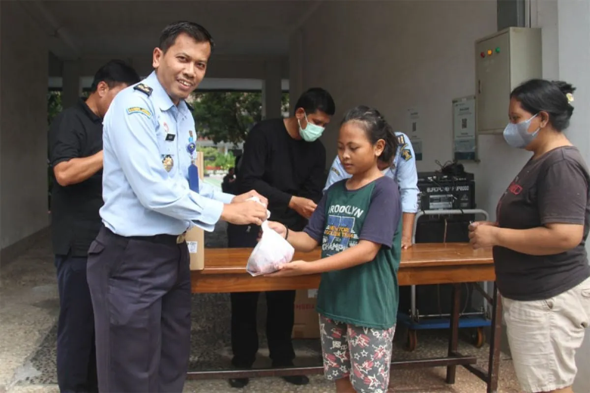 Setelah melaksanakan penyembelihan dan pemotongan hewan qurban, secara simbolis Kakanwil didampingi Kadivmin dan Kadivpas menyerahkan daging qurban kepada 5 orang perwakilan PPNPN usai apel pagi pegawai.