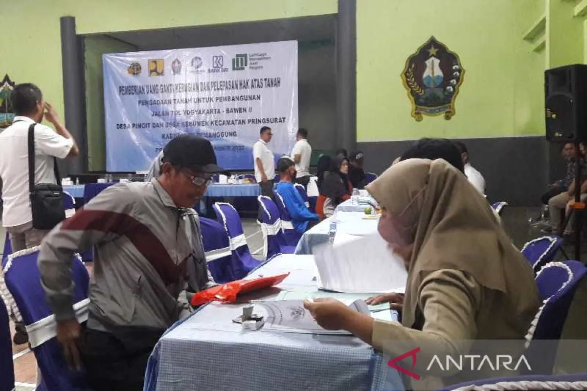 Temanggung (ANTARA) - Belasan pemilik bidang tanah terdampak proyek jalan tol Bawen-Yogyakarta di Desa Pingit dan Desa Kebumen Kabupaten Temanggung mendapat pembayaran ganti rugi.