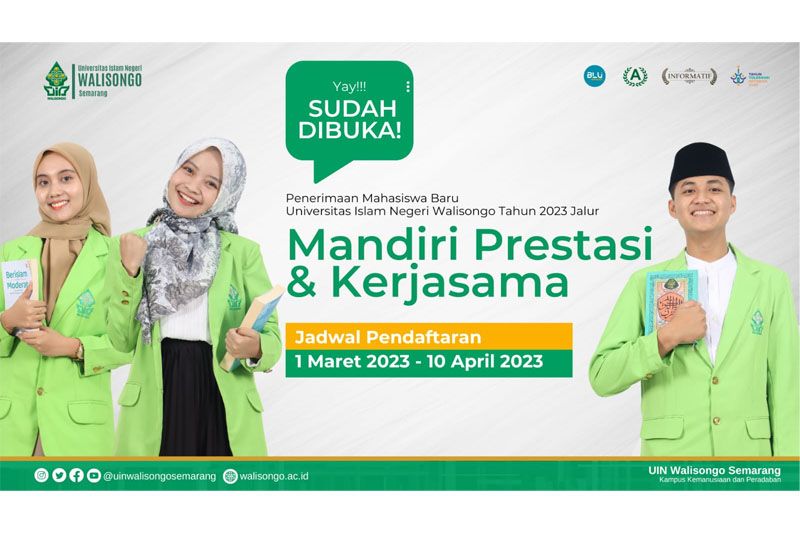 Semarang (ANTARA) - Universitas Islam Negeri (UIN) Walisongo membuka penerimaan mahasiswa baru (PMB) jalur mandiri prestasi dan kerja sama mulai 1 Maret 2023. Jalur tersebut merupakan pola penerimaan calon mahasiswa baru yang diselenggarakan oleh UIN Walisongo Semarang melalui penelusuran prestasi akademik dan/atau prestasi non-akademik dan/atau prestasi luar biasa lainnya.