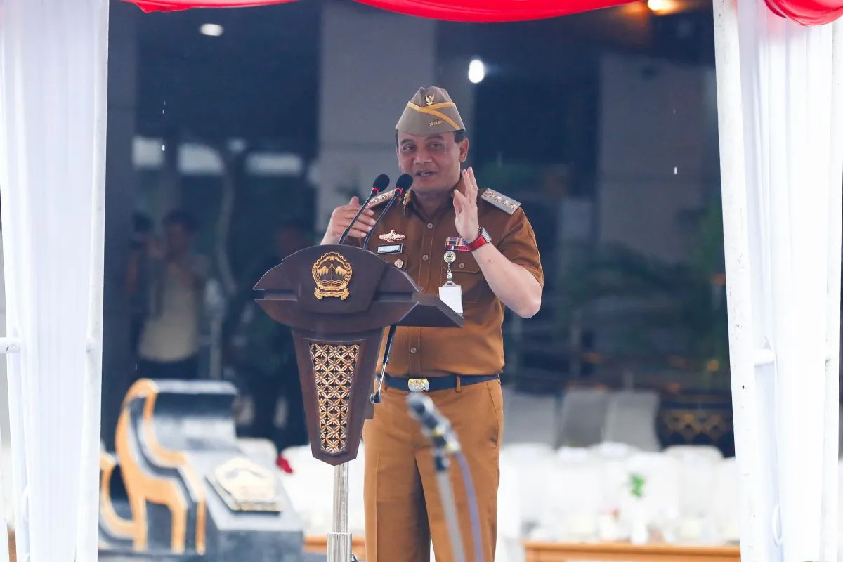 "Apel kok ada yang duduk gimana? Kepala daerah ayo berdiri. Ikut apel. Ini kita apel, bukan nonton apel," celetuknya sambil tersenyum, memancing tawa seluruh peserta apel.
