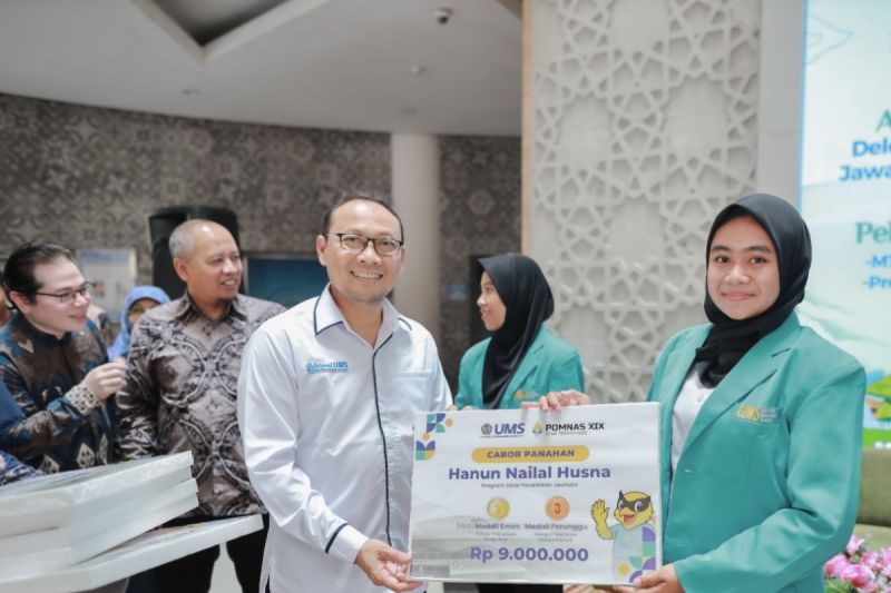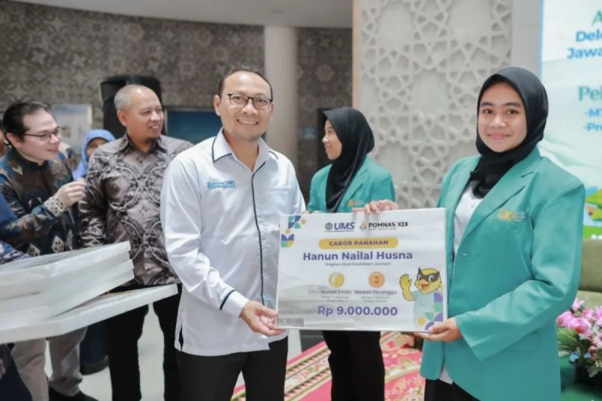 Solo (ANTARA) - Universitas Muhammadiyah Surakarta (UMS) memberikan apresiasi kepada mahasiswa yang berprestasi dalam bidang olahraga kepada para atlet Pekan Olahraga Mahasiswa Nasional (POMNAS) XIX 2025. Acara tersebut sekaligus Pelepasan Delegasi Musabaqah Tilawatil Qur'an Mahasiswa Nasional (MTQMN) XVIII Kafilah UMS dan Program Badan Eksekutif Mahasiswa (BEM) Berdampak.