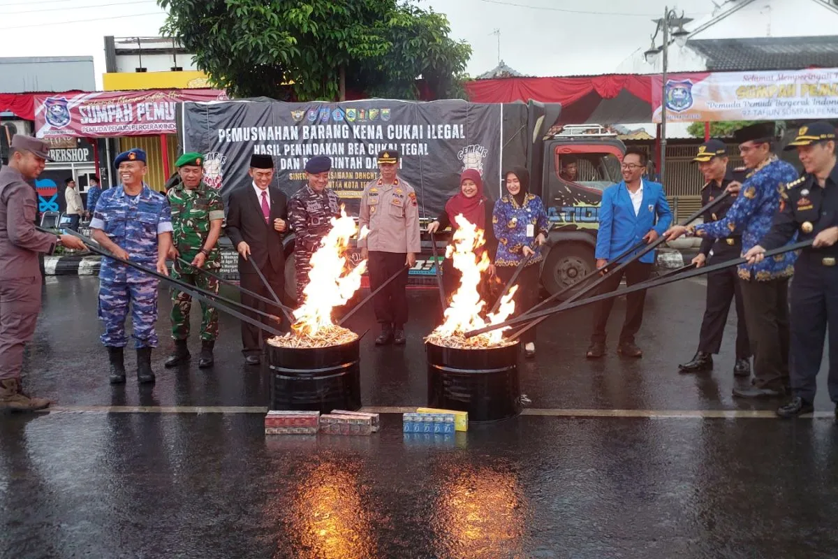 Tegal (ANTARA) - Pemerintah Kota Tegal bersama Kantor Bea Cukai Tegal melaksanakan pemusnahan secara simbolis sebanyak 5.267.876 batang rokok ilegal dengan nilai barang sekitar Rp7,72 miliar dan potensi kerugian negara sebesar Rp5,07 miliar pada rangkaian Upacara Peringatan Hari Sumpah Pemuda ke-97 Tahun 2025 di Jalan Pancasila, Kota Tegal, Selasa (28/10).