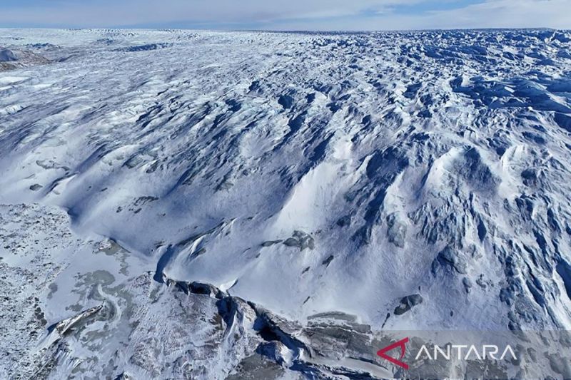 Foto dari udara ini menunjukkan lapisan es di dekat Kangerlussuaq, Greenland, sebuah wilayah di Denmark yang memiliki otonomi tingkat tinggi (21/3/2025). ANTARA/Xinhua/Zhao Dingzhe/aa.