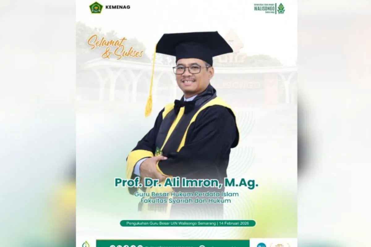 Semarang (ANTARA) - Hukum Perdata Islam tidak boleh berhenti sebagai teks normatif yang diterapkan secara mekanis. Ia harus hidup, berdialog dengan realitas sosial, dan menghadirkan keadilan substantif. Pesan itu ditegaskan Prof. Dr. Ali Imron, S.Ag., S.H., M.Ag., dalam pidato pengukuhannya sebagai Guru Besar Hukum Perdata Islam Indonesia di UIN Walisongo Semarang, Sabtu (14/2/2026).