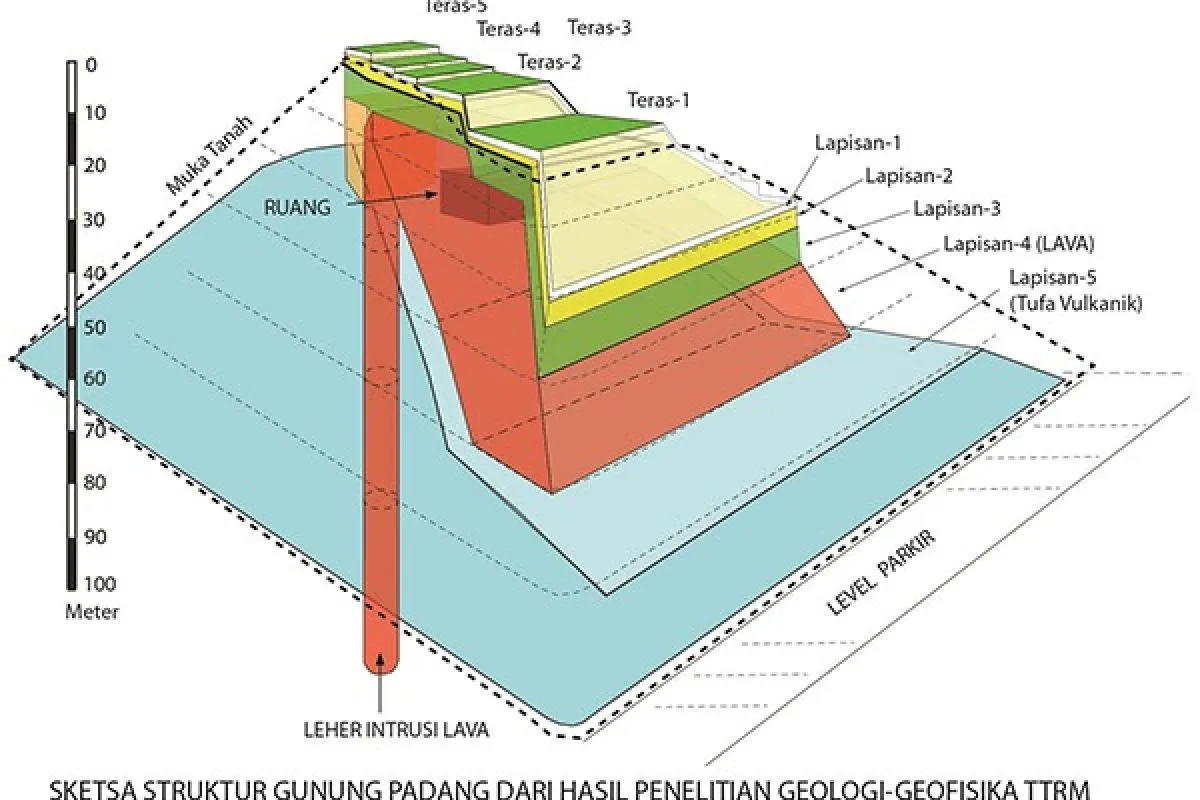 Pada kedalaman 15 meter barulah pengeboran menembus formasi batuan alamiah/geologi berupa tubuh batuan lava basaltik masif terkekarkan. Tebal lava mencapai lebih dari 15 meter. Setelah dilakukan grid lintasan geolistrik yang cukup rapat dengan resolusi tinggi (spasing elektroda 2 m) ternyata tubuh lidah lava ini tidak begitu saja menclok di atas bukit yang memanjang utara-selatan tapi ditemukan leher intrusibatuan magmanya di sebelah timur Teras 3 dan 4, tidak di bawah teras-teras situs. Leher intrusi ini kira-kira berdiameter sekitar 15-20 m.