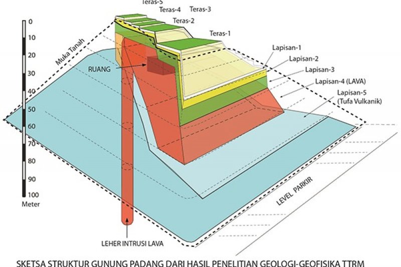 Beda tinggi antara permukaan teras situs di atas dengan horison, lapisan 1,2,3 ini terpancung adalah sekitar 30 meter di semua lintasan geolistrik dari Teras-1 sampai Teras-4, sangat konsisten. Di Teras-5 beda tingginya hanya 20 meter. Dari fakta-fakta ini sangat sukar kalau tidak mustahil bagi siapapun untuk menginterpretasikan bahwa lapisan 1,2,3 adalah lapisan geologi. Jauh lebih masuk akal apabila diinterpretasikan sebagai bangunan berbentuk trapesium memanjang utara-selatan; Jadi bolehlah kalau dibilang mirip piramid terpancungnya Bangsa Maya di Amerika Selatan, dengan catatan bagian sisi selatannya berdinding tegak.