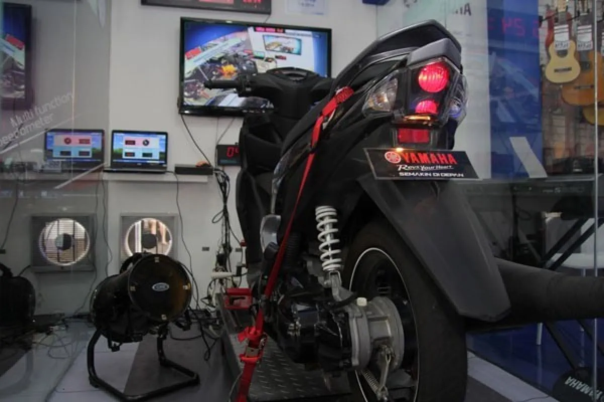 Motor GT125 ditempatkan di dynotest sehingga roda belakang bisa berputar layaknya berkendara seperti biasa.