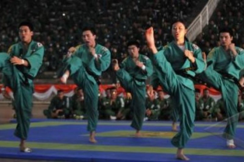 Sejumlah atlet beladiri yongmoodo asal Korea Selatan saat melakukan demonstrasi yongmoodo, pada pengukuhkan dan pelantikan pengurus Ferderasi Yongmoodo Daerah Jawa Tengah di GOR Jatidiri Semarang, Jateng, Minggu (23/9). Ketua Umum Federasi Yong Moodo Indonesia Letjen TNI Gatot Nurmantyo yang juga menjabat sebagai Dankodiklat TNI AD melantik Pangdam IV/Diponegoro Mayjen TNI Hardiono Saroso sebagai ketua umum yongmoodo untuk daerah Jateng. FOTO ANTARA/R. Rekotomo/tom/12.