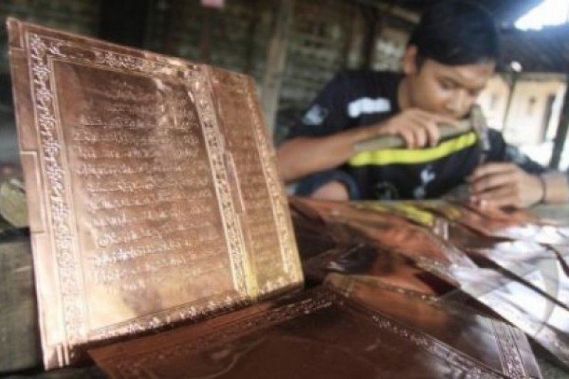 Pekerja melakukan proes pembuatan Al Quran dari lempengan tembaga di Sentra kerajinan Tembaga, Tumang, Boyolali, Jateng, Rabu (13/2). Kerajinan yang dijual seharga Rp50 Juta perset tersebut guna memenuhi permintaan ke sejumlah negara seperti Malaysia, Malaysia dan Jepang. FOTO ANTARA/Akbar Nugroho Gumay/tom/13.