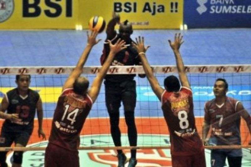 Pemain Palembang Bank Sumselbabel Poey Romero (1) mengembalikan bola yang coba diblok dua pemain Jakarta Pertamina Energi Dvoranen (14) dan Douglas Duarte (8), pada pertandingan voli putra Proliga di GOR Jatidiri Semarang, Jateng, Minggu (7/4). Palembang Bank Sumselbabel mengalahkan Jakarta Pertamina Energi dengan skor 3-0 ( 25-22, 32-30, 25-20). FOTO ANTARA/R. Rekotomo/tom/13.