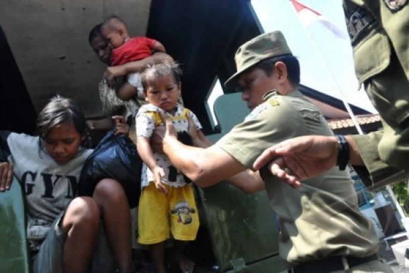 Seorang petugas mengamankan anak gelandangan saat razia pengemis, gelandangan dan orang terlantar (PGOT) di Tegal, Jateng, Kamis (2/5). Razia gabungan Dinas Sosial, Satpol PP dan Polres Tegal Kota tersebut menjaring 19 gelandangan dan 3 anak - anak serta melakukan pemeriksaan infeksi menular seksual (IMS) dan HIV oleh Dinas Kesehatan dan selanjutnya dikirim ke panti sosial untuk pembinaan dan latihan ketrampilan. FOTO ANTARA/Oky Lukmansyah/Koz/pd/13.