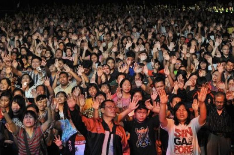 Sejumlah umat Nasrani melakukan doa dan menyanyikan lagu-lagu rohani, saat mengikuti Kebaktian Kebangunan Rohani (KKR) dan Doa bagi Bangsa Negara, di Stadion Tri Lomba Semarang, Jateng, Rabu (26/6) malam. KKR yang diikuiti ribuan umat dari berbagai kota di Jawa Tengah itu antara lain bertujuan membangkitkan kecintaan antar sesama umat manusia. ANTARA FOTO/R. Rekotomo/tom/13.