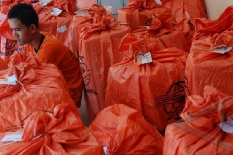 Pekerja menyiapkan paket berisi buku kurikulum 2013 untuk tingkat SMP di Kantor Pos Kudus, Kudus, Jateng, Rabu (17/7). Kantor Pos mendistribusikan buku kurikulum 2013 hasil cetakan PT. Pura itu ke daerah Kepulauan Riau, Jambi dan Jawa. FOTO ANTARA/ Andreas Fitri Atmoko/tom/13.
