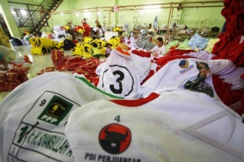 Sejumlah pekerja menyelesaikan pembuatan kaos bergambar parpol dan caleg di Sukoharjo, Jateng, Jumat (13/12). Konveksi kaos mengalami banjir pesanan hingga meningkat dua-tiga kali lipat dari hari biasa akibat banyaknya pesanan caleg maupun parpol menjelang masa kampanye yang berlangsung 2014 mendatang. ANTARA FOTO/Akbar Nugroho Gumay/tom/13.