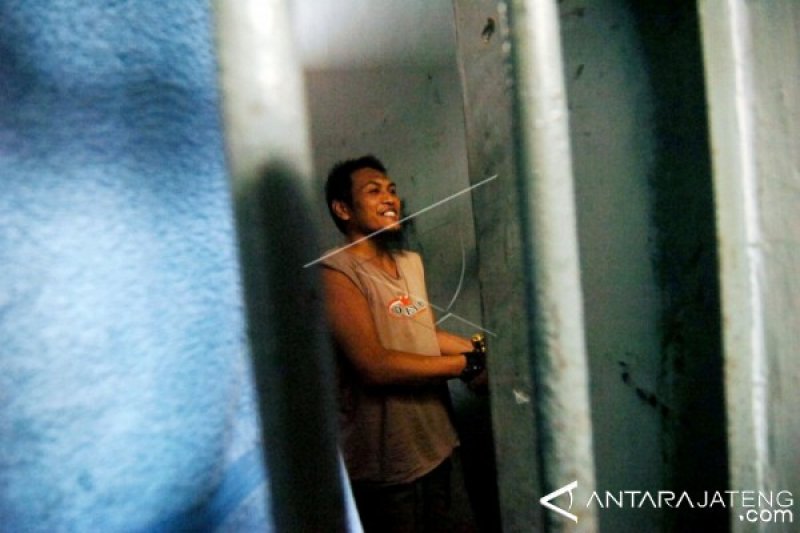 Tahanan terduga teroris, Muhammad Khoirul Anam berada di ruang tahanan Lapas II B Tegal, Jawa Tengah, Rabu (9/8). Menurut pihak lapas, terduga teroris Khoirul Anam yang juga merupakan pimpinan Jemaah Islamiyah (JI) se Asia dan sebagai perakit senjata tersebut dipindah dari rutan Salemba dengan vonis 6 tahun 8 bulan. ANTARA FOTO/Oky Lukmansyah/tom/17.