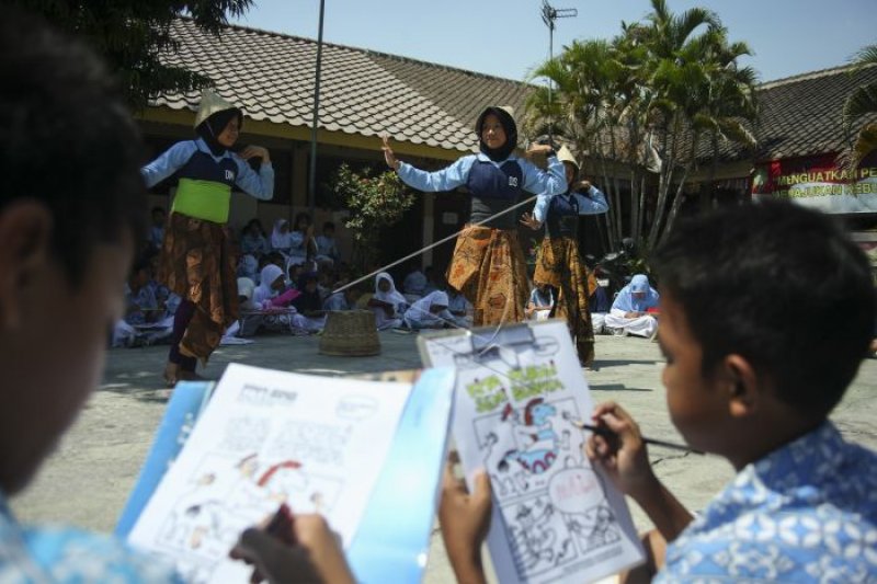 Siswa SD Negeri VI Mojosongo Solo mengikuti acara kolaborasi tari dan mewarnai gambar komik di halaman sekolah setempat, Solo, Jawa Tengah, Rabu (5/9). Kegiatan untuk menyambut acara Solo International Performing Art 2018 bertujuan melestarikan seni gambar komik kepada generasi muda. ANTARA FOTO/Maulana Surya/tom/18.