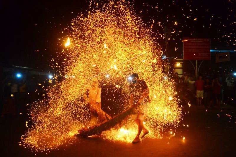 Peserta saling serang menggunakan obor saat tradisi perang obor di Desa Tegalsambi, Jepara, Jawa Tengah, Senin (21/7/2020). Tradisi perang obor sebagai wujud syukur masyarakat kepada Tuhan YME itu tetap digelar di tengah pandemi COVID-19 dengan menerapkan protokol kesehatan serta dengan jumlah peserta dan waktu terbatas guna menghindari kerumunan yang bisa menjadi medium penyebaran COVID-19. ANTARA FOTO/Yusuf Nugroho/tom.