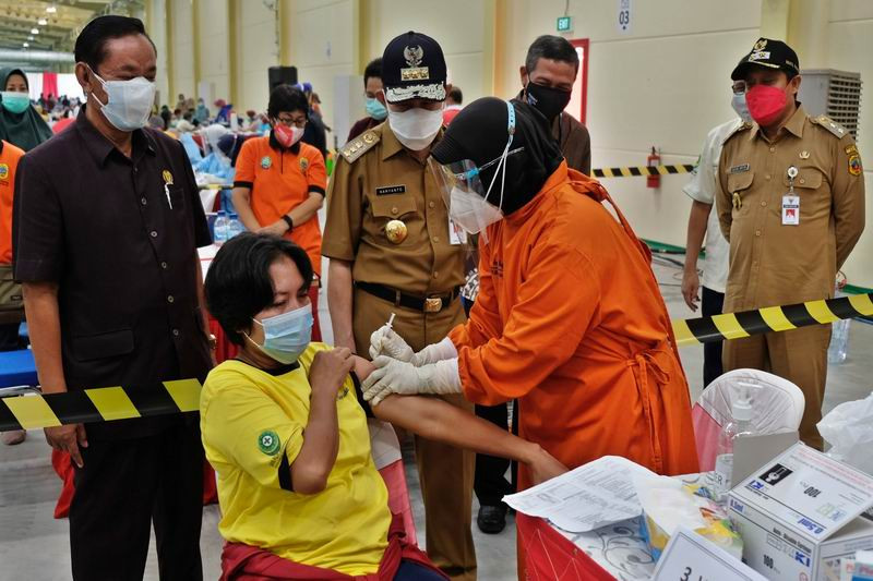 Bupati Pati sekaligus Ketua Satuan Tugas Penanganan COVID-19 Pati Haryanto (ketiga kanan), didampingi Head of Manufacturing Garudafood Awan Susila (kedua kanan), Wakil Bupati Pati Syaiful Arifin (kanan), dan Ketua DPRD Pati Suwarno (kiri) meninjau pelaksanaan vaksinasi COVID-19 massal bertema “Serbuan Vaksinasi Kabupaten Pati, Semangat Garudafood untuk Indonesia Lebih Sehat”, di pabrik Garudafood Pati, Jawa Tengah, Selasa (6/7/2021). Vaksinasi massal yang dilaksanakan pada 6 – 7 Juli 2021 itu menargetkan 3.000 karyawan pabrik Garudafood sebagai penerima vaksin dan diharapkan dapat menekan laju penyebaran COVID-19 di Pati serta mempercepat terbentuknya herd immunity di tanah air. ANTARA/HO-Humas Garudafood/tom.