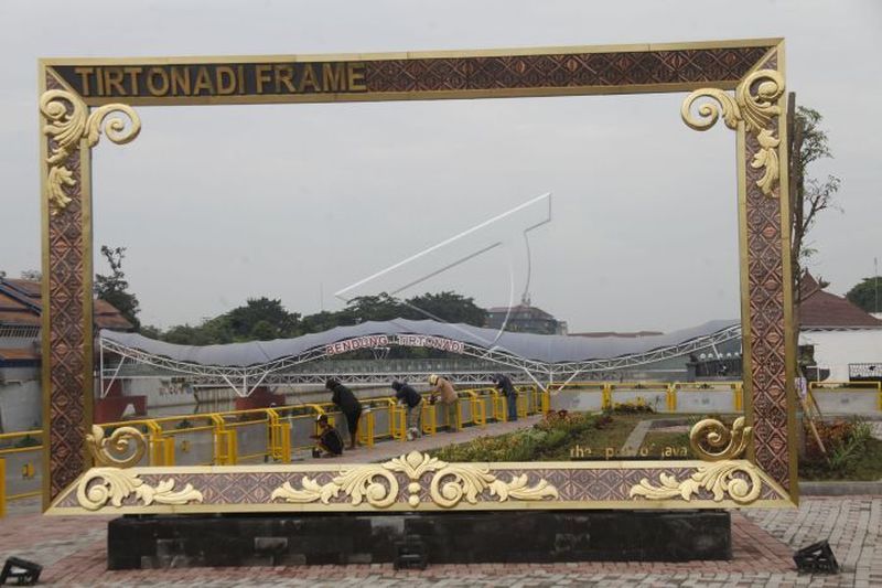Pekerja mengusung tangga melintasi Tirtonadi Frame di kawasan Bendung Karet Tirtonadi Solo, Jawa Tengah, Kamis (13/1/2022). Tirtonadi Frame yang dibangun Kementerian Pekerjaan Umum dan Perumahan Rakyat (PUPR) melalui Balai Besar Wilayah Sungai (BBWS) Bengawan tersebut didirikan sebagai daya tarik bagi wisatawan berkunjung di Solo sekaligus sarana edukasi pelestariaan keberadaan sumber air di kawasan setempat. ANTARAFOTO/Maulana Surya/tom.