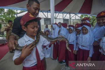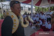 Seorang pegiat mengenalkan ular kepada siswa di Keposong, Tamansari, Boyolali, Jawa Tengah, Senin (18/9/2023). Pengenalan ular yang dilakukan oleh Komunitas Oemah Ulo bertujuan untuk mengedukasi siswa dan warga terhadap berbagai ular liar berbisa tentang cara penangannya agar rantai makanan di lingkungan tetap terjaga. ANTARA FOTO/Aloysius Jarot Nugroho/tom.