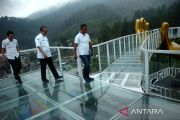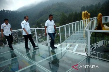Petugas memeriksa wahana kaca di Obyek Wisata Baron Hill, Guci, Kabupaten Tegal, Jawa Tengah, Rabu (1/11/2023). Dinas Penanaman Modal Dan Pelayanan Terpadu Satu Pintu (DOMPTSP) Kabupaten Tegal menutup tiga wahana kaca yang berada di Obyek Wisata Guci terkait kecelakaan kaca pecah di Kabupaten Banyumas yang mengakibatkan satu pengunjung meninggal. ANTARA FOTO/Oky Lukmansyah/tom.