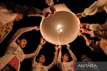 Sejumlah bhikku menerbangkan lampion perdamaian dalam rangakaian Pabbajja Samanera Sementara di Marga Utama, Borobudur, Magelang, Jawa Tengah, Sabtu (23/12/2023). Penerbangan lampion perdamaian sebagai simbol permohonan doa dan harapan agar pada tahun politik 2024 mendapat pemimpin yang bisa membawa bangsa Indonesia aman, damai, dan sejahtera. ANTARA FOTO/Anis Efizudin/tom.
