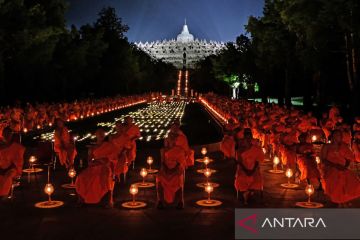 Sejumlah bhikku bermeditasi saat prosesi penerbangan lampion perdamaian dalam rangkaian Pabbajja Samanera Sementara di Marga Utama, Borobudur, Magelang, Jawa Tengah, Sabtu (23/12/2023). Penerbangan lampion perdamaian sebagai simbol permohonan doa dan harapan agar pada tahun politik 2024 mendapat pemimpin yang bisa membawa bangsa Indonesia aman, damai, dan sejahtera. ANTARA FOTO/Anis Efizudin/tom.
