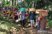 Warga mengusung tenong berisi berbagai jenis makanan saat tradisi Nyadran Perdamaian di Krecek, Getas, Kaloran, Temanggung, Jateng, Jumat (12/1/2024). Tradisi nyadran atau merti dusun yang diikuti penganut agama Islam, Buddha, dan Katolik tersebut merupakan tradisi turun temurun sebagai bentuk toleransi dan kerukunan warga lintas agama sekaligus berdoa untuk kelancaran Pemilu 2024. ANTARA FOTO/Anis Efizudin/tom.