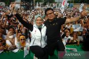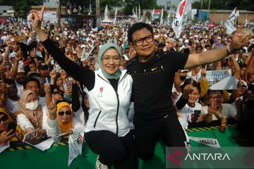 Calon wakil presiden Muhaimin Iskandar (kanan) dan istrinya foto bersama pendukungnya saat kampanye akbar "Amin" di Lapangan Desa Pendawa, Kabupaten Tegal, Jawa Tengah, Selasa (30/1/2024). Dalam orasinya, caapres-cawapres nomor urut 1 Anies Baswedan - Muhaimin Iskandar mengatakan akan membasmi mafia pupuk, membuka 15 juta lapangan kerja dan menstabilkan harga pangan. ANTARA FOTO/Oky Lukmansyah/tom.
