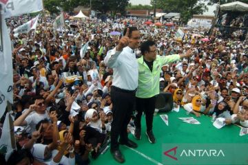 Calon presiden nomor urut 1 Anies Baswedan (kiri) bersama calon wakil presiden Muhaimin Iskandar (kanan) menyapa pendukungnya saat kampanye akbar "Amin" di Lapangan Desa Pendawa, Kabupaten Tegal, Jawa Tengah, Selasa (30/1/2024). Dalam orasinya, caapres-cawapres nomor urut 1 Anies Baswedan - Muhaimin Iskandar mengatakan akan membasmi mafia pupuk, membuka 15 juta lapangan kerja dan menstabilkan harga pangan. ANTARA FOTO/Oky Lukmansyah/tom.