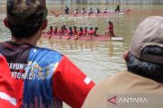 Peserta berpacu saat mengikuti Lomba Dayung Perahu Naga di Bendung Tirtonadi Solo, Jawa Tengah, Kamis (7/3/2024). Lomba tersebut digelar untuk memperingati Hari Air Sedunia sekaligus memopulerkan olahraga dayung perahu naga bagi masyarakat di Kota Solo. ANTARAFOTO/Maulana Surya/tom.