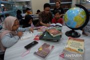 Sejumlah anak didampingi petugas membaca buku di perpustakaan Masjid Agung Solo, Jawa Tengah, Rabu (13/3/2024). Perpustakaan yang berisi koleksi naskah kuno, kitab kuning, dan buku-buku literasi bertema Islam tersebut ramai dikunjungi warga selama bulan Ramadhan untuk mengisi waktu ibadah puasa dengan kegiatan yang bermafaat. ANTARA FOTO/Maulana Surya/tom.