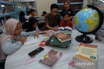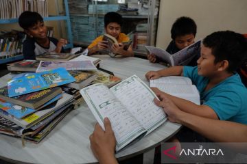 Sejumlah anak membaca buku di perpustakaan Masjid Agung Solo, Jawa Tengah, Rabu (13/3/2024). Perpustakaan yang berisi koleksi naskah kuno, kitab kuning, dan buku-buku literasi bertema Islam tersebut ramai dikunjungi warga selama bulan Ramadhan untuk mengisi waktu ibadah puasa dengan kegiatan yang bermafaat. ANTARA FOTO/Maulana Surya/tom.