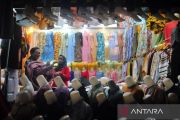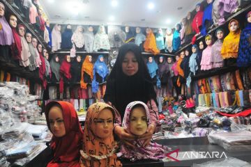 Pedagang busana muslim melayani pembeli di Pasar Kliwon, Kudus, Jawa Tengah, Rabu (3/4/2024). Sepekan jelang Lebaran penjualan berbagai busana muslim seperti baju koko, baju gamis, dan jilbab yang dijual Rp15 ribu hingga Rp400 ribu itu meningkat hingga dua kali lipat dibanding hari biasa. ANTARA FOTO/Yusuf Nugroho/tom.