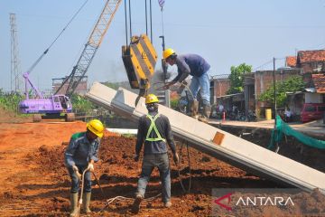 Pekerja menyelesaikan pembangunan kolam retensi di Desa Jati Wetan, Kudus, Jawa Tengah, Kamis (30/5/2024). Pembangunan kolam retensi atau embung seluas 5 hektare sebagai pengendali banjir oleh kementerian PUPR dengan APBN sebesar Rp350 miliar itu ditargetkan selasai pada Desember 2024 dan diharapkan dapat mengurangi banjir hingga 80 persen. ANTARA FOTO/Yusuf Nugroho/tom.