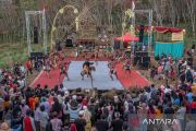Kelompok seni menampilkan tari Kuda Lumping (Jaran Kepang) dalam pagelaran Gelar Karya Jaran Kepang 2024 bertajuk Sad Turonggo Gumregah #1 (enam kuda yang bangkit) di Dusun Sombron, Desa Tlompakan, Kabupaten Semarang, Jawa Tengah, Sabtu (20/07/2024). Gelar karya oleh Lembaga Nguri-uri Kebudayaan Sombron untuk pertama kali digelar secara swadaya dengan menampilkan delapan kelompok seni kuda lumping dari Kabupaten Semarang dan Temanggung itu sebagai upaya melestarikan kebudayaan lokal guna meningkatkan dan mengembangkan potensi sektor pariwisata budaya serta UMKM lokal di tengah gempuran budaya asing di era digital. ANTARA FOTO/Aji Styawan/tom.