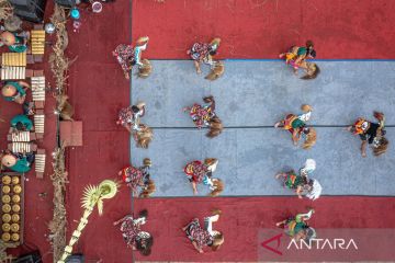 Foto udara kelompok seni menampilkan tari Kuda Lumping (Jaran Kepang) dalam pagelaran Gelar Karya Jaran Kepang 2024 bertajuk Sad Turonggo Gumregah #1 (enam kuda yang bangkit) di Dusun Sombron, Desa Tlompakan, Kabupaten Semarang, Jawa Tengah, Sabtu (20/07/2024). Gelar karya oleh Lembaga Nguri-uri Kebudayaan Sombron untuk pertama kali digelar secara swadaya dengan menampilkan delapan kelompok seni kuda lumping dari Kabupaten Semarang dan Temanggung itu sebagai upaya melestarikan kebudayaan lokal guna meningkatkan dan mengembangkan potensi sektor pariwisata budaya serta UMKM lokal di tengah gempuran budaya asing di era digital. ANTARA FOTO/Aji Styawan/tom.