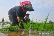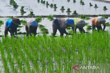 Sejumlah buruh tani menanam bibit padi di persawahan Desa Klaling, Jekulo, Kudus, Jawa Tengah, Jumat (26/7/2024). Meskipun musim kemarau para petani di wilayah itu masih dapat menanam padi pada masa tanam ketiga atau tiga kali panen dalam setahun dengan memanfaatkan pengairan irigasi dari Bendungan Logung yang telah selesai dibangun oleh Kementerian PUPR pada 2018. ANTARA FOTO/Yusuf Nugroho/tom.