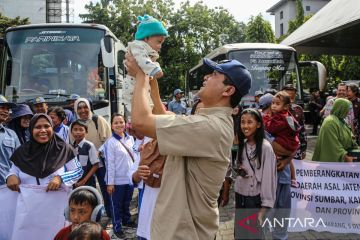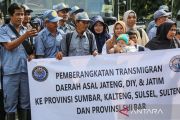 Peserta transmigran bersama anggota keluarganya bersiap berangkat sebelum dilepas oleh Menteri Transmigrasi Muhammad Iftitah Sulaiman Suryanugraha dan Menteri Koordinator Bidang Infrastruktur dan Pembangunan Kewilayahan Agus Harimurti Yudhoyono saat pelepasan program transmigran di halaman Gedung Gradhika Bhakti Praja, Semarang, Jawa Tengah, Kamis (5/12/2024). Sebanyak 64 peserta transmigran asal Jawa Tengah, Daerah Istimewa Yogyakarta, dan Jawa Timur yang akan ditempatkan ke Sumatera Barat, Kalimantan Tengah, Sulawesi Selatan, Sulawesi Tengah, serta Kalimantan Barat tersebut diharapkan dapat menggelorakan kembali peranan transmigrasi demi meningkatkan kesejahteraan hidup masyarakat Indonesia yang merata. ANTARA FOTO/Makna Zaezar/tom.